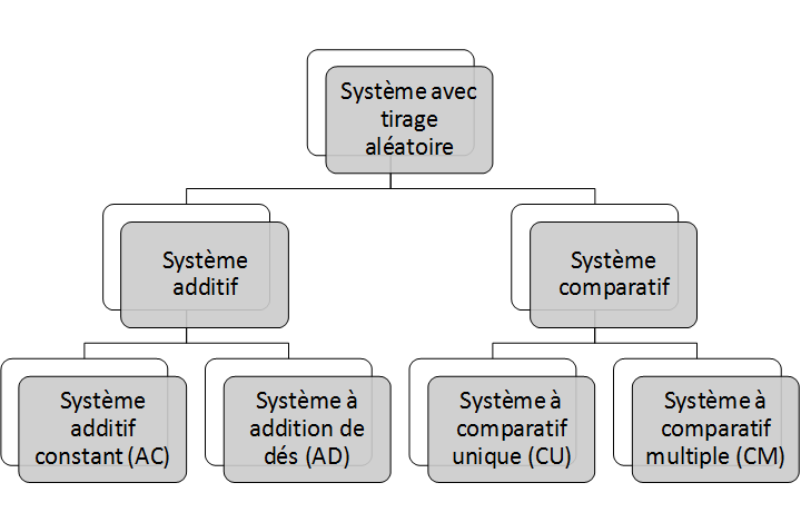 Dans un premier temps on peut diviser les systèmes en deux parties. Comme dirait Usul2000 « dans la vie, il y a les systèmes avec des additions et ceux qui n’en ont pas ». Bref, je vais diviser mon propos sur les systèmes en un embranchement de « système additif » (où le résultat du/des dé(s) est additionné) et un embranchement comparatif (où le résultat du/des dé(s) est comparé).